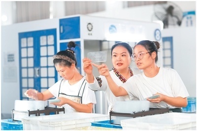 李洪梅(中)在指导员工加工手机膜。 陈 杰摄