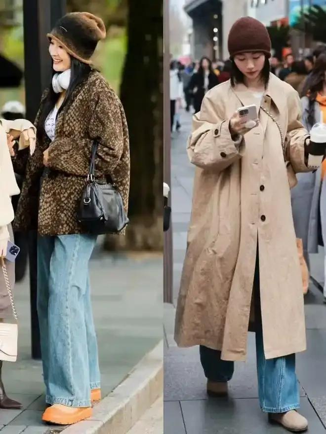 我们还可以选择一件卡其色的风衣,搭配上牛仔直筒阔腿裤,脚穿一双大地色系的勃肯鞋,头戴棕咖色的针织帽,这样的打扮比较有气场。不过牛仔裤天生就拥有时尚元素,搭配任何衣服外套都好看。