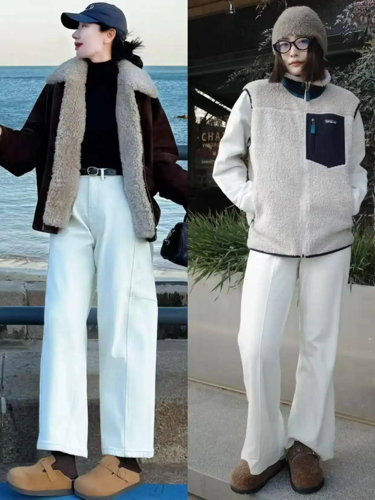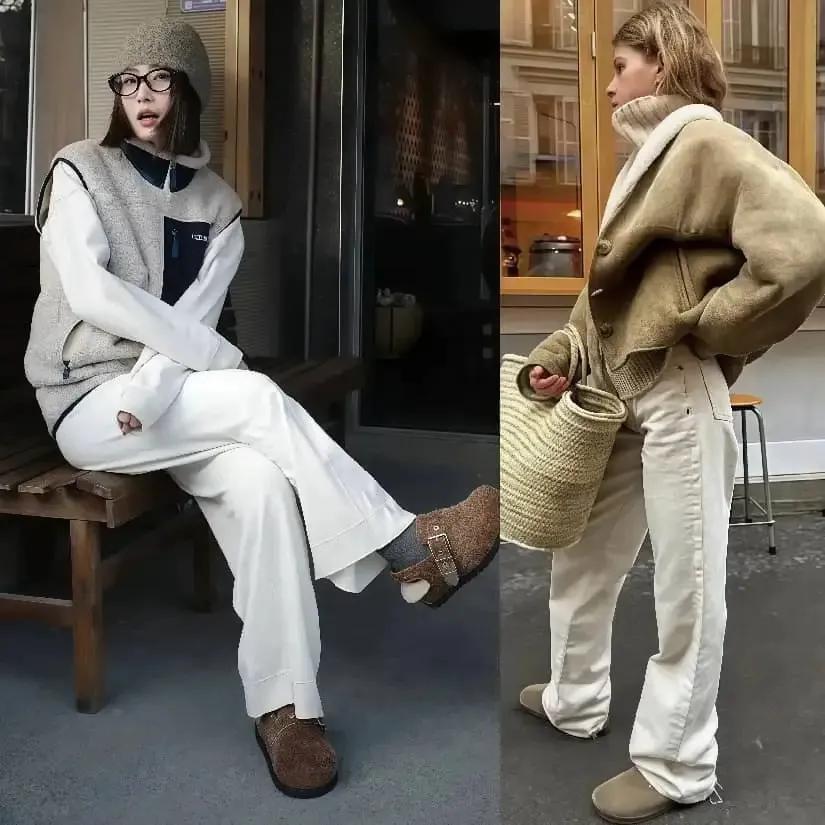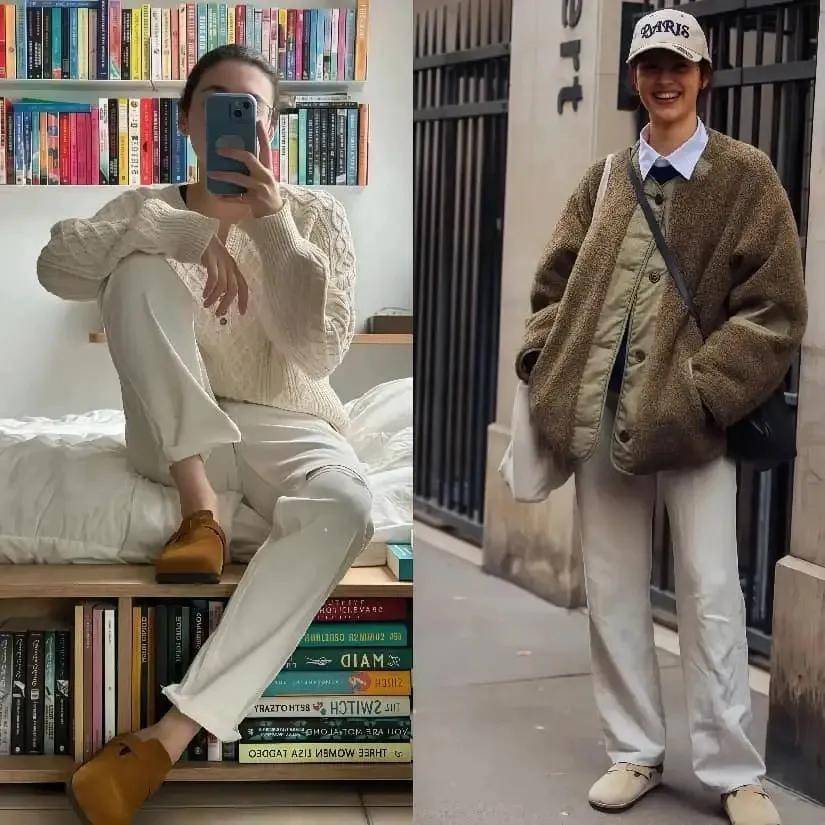 在南方城市生活的你,完全可以选择驼色的一脚蹬勃肯鞋来搭配上白色的直筒阔腿裤,加上一件毛绒短外套,内搭针织毛衣,加上棒球帽。这样的穿衣打扮出门拍照很出片。