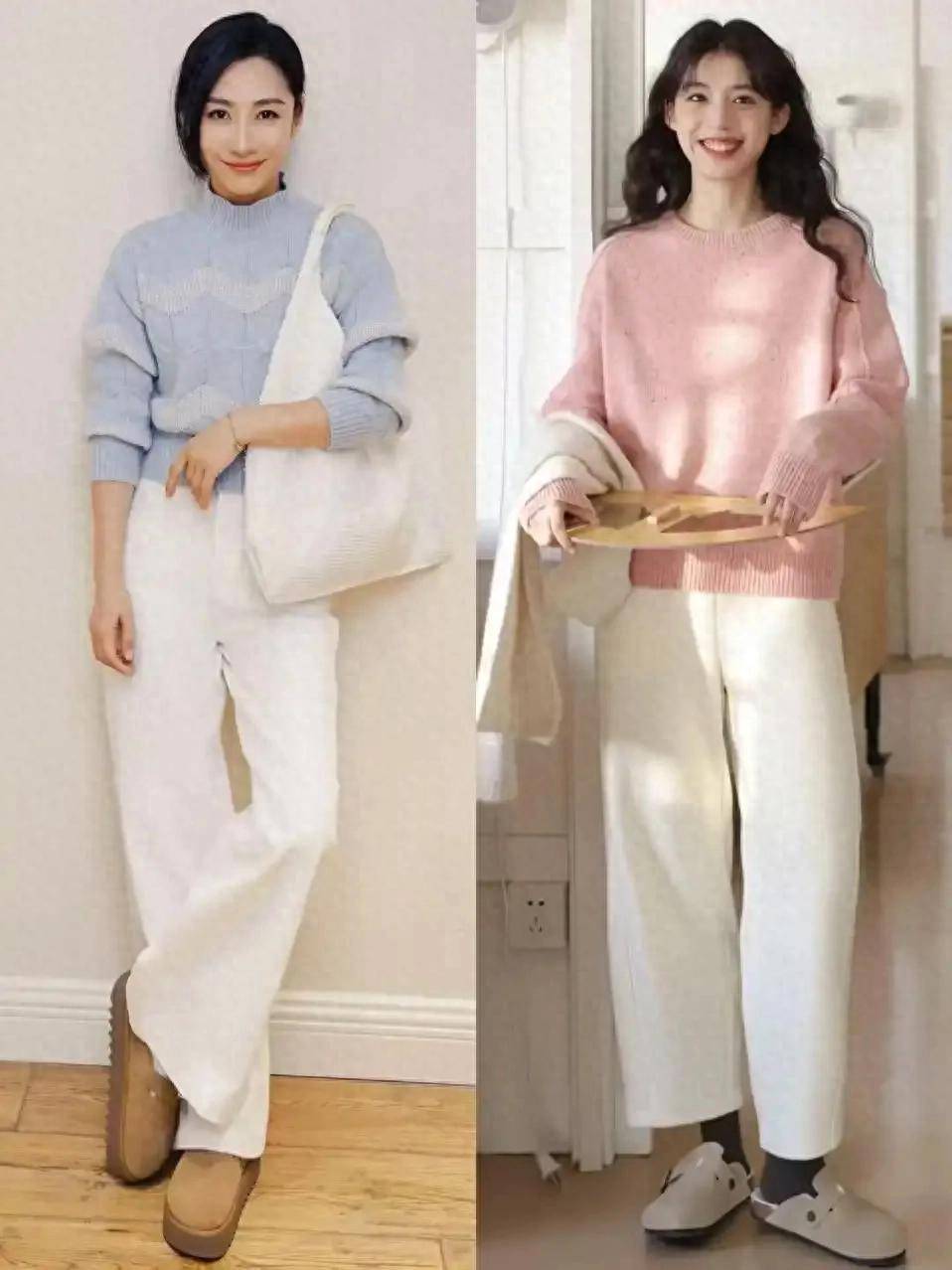 就像上面这两位时尚达人,选择的雾霾蓝和浅紫色的毛衣,搭配上一条白色的阔腿长裤,脚穿一双勃肯鞋,轻松呈现出精致时髦的造型。