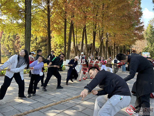 在云南民族村,游客白天可在村寨中体验云南25个少数民族的活态非遗与民俗展演,与上百名NPC互动对歌、挑战闯关、赢取“贝币”。夜晚,园区化身为民族文化光影乐园,绚丽的3D光影与实景演艺交织出奇幻之夜。云·彩集市与临水美食街汇集地道云南风味,游客可在民谣相伴中尽享冬日惬意。